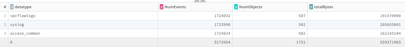 This analytic looks in your S3-based Dataset and counts the number of objects (files, usually), the number of events in those files, and the number of bytes in those events. You can run this over a large sample of data - say, several days - to get a feel for how much data is in your S3 bucket.