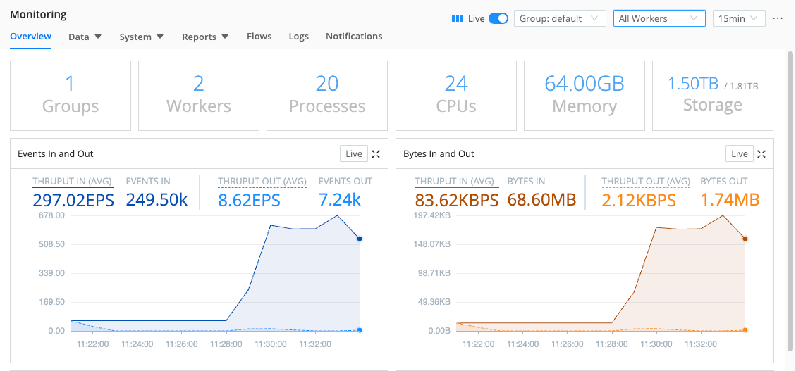 To verify the whole configuration you’ve created, in the sidebar, select Monitoring. On the Monitoring page, use the All Worker Groups drop-down (upper right) to toggle between the two Worker Groups to see the division of labor: